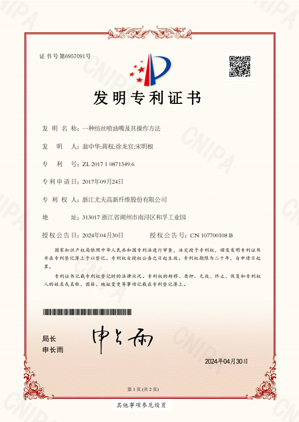 • 發(fā)明專(zhuān)利證書(shū)一種紡絲噴油嘴及其操作方法