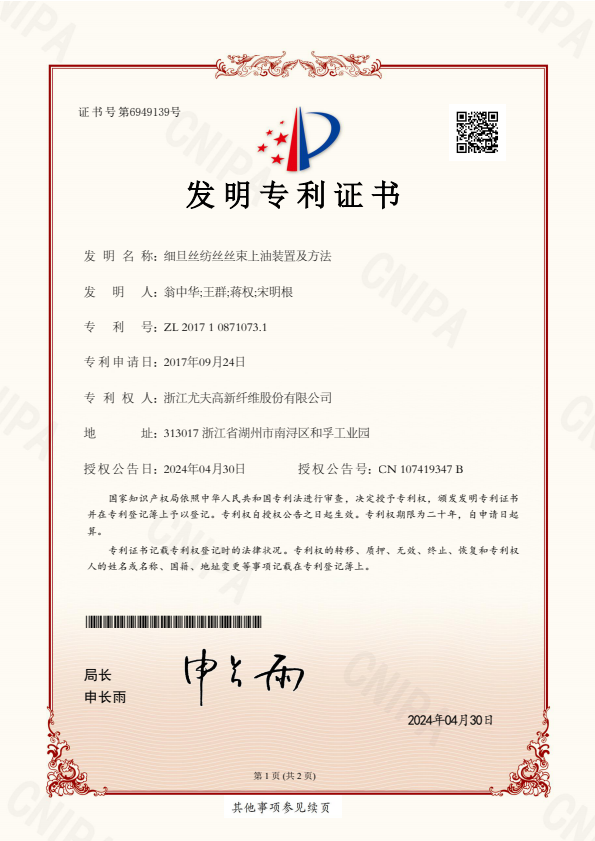 • 發(fā)明專(zhuān)利證書(shū)細(xì)旦絲紡絲絲束上油裝置及方法